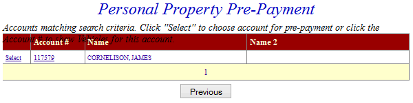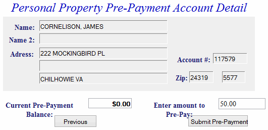 The Account Detail Screen shows more information about the property including any prepayment balance. Enter amount to prepay and then press Make Payment button. Pressing the Previous button returns to the first screen. |