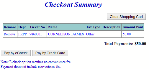 On Line Payment Checkout screen now shows both bills. The amount to pay entered for each bill is shown in the Total Payments field. Proceed as normal from this point. All tickets can be removed by pressing Clear Shopping Cart button. To pay by electronic check, press Pay by eCheck button. For credit card payments, press Pay by Credit Card button. |