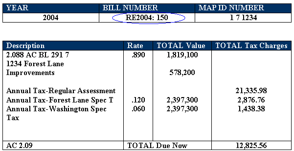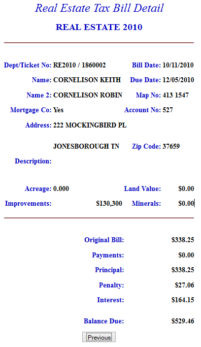 Bill Detail Screen - This screen contains additional information about the tax bill. Press the Previous button to return to Total Bill screen. |