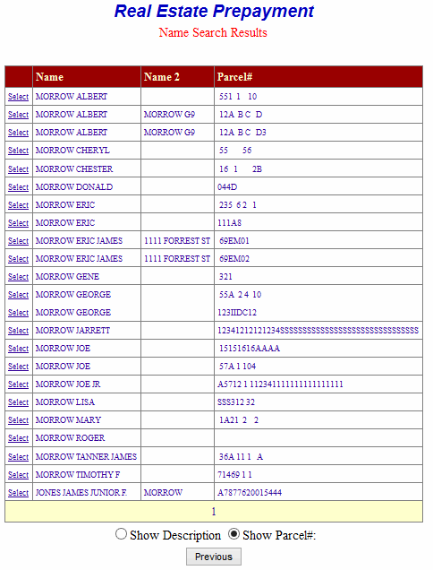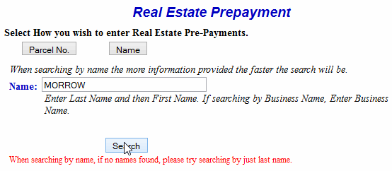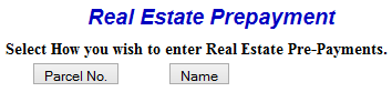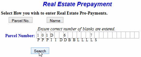 | On the Real Estate Pre-Payments Screen, find tax information by using Name or Parcel Number. |