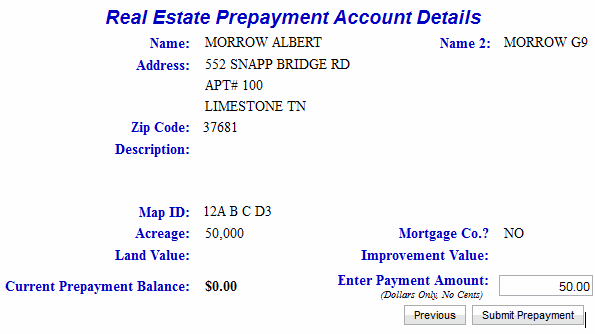 | The Account Detail Screen shows more information about the property including any prepayment balance. Enter amount to prepay and then press Make Payment button. Pressing the Previous button returns to the first screen. |
