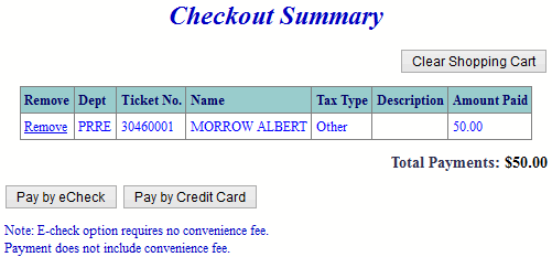 On Line Payment Checkout Enter an amount to pay in Total Payments. All tickets can be removed by pressing Clear Shopping Cart button. For credit card payments, press Pay by Credit Card button, or press Pay be Echeck to pay with an electronic check. |