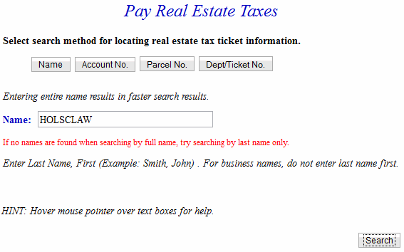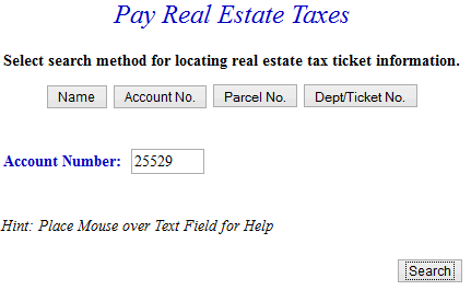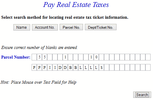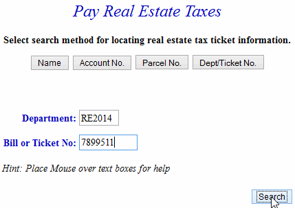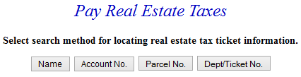 On the Pay Real Estate Taxes Online Screen, press the button containing your preferred method for finding tax information: Department & Ticket Number, Parcel Number, Name or Account Number. |