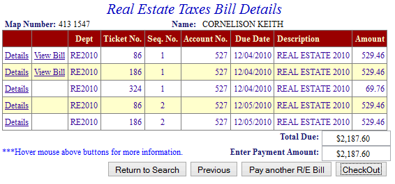 Total Bill Screen - The full amount due is shown in the Enter Amount You Wish To Pay Today field, but you can pay a different amount by replacing the figure shown. To view bill details, click Details next to the desired ticket. If you wish to search for another ticket and attach it to the current bill before payment is made, press the Pay another R/E Bill button. To pay the current bill only, press the Checkout button. If the information shown is incorrect, press the Return to Search button and return to the Pay Real Estate Taxes Online screen. |