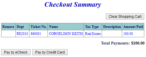 Online Payment Checkout - The Total Payments field displays the elected payment amount for the attached bills. All tickets can be removed by pressing the Clear Shopping Cart button. For credit card payments, press Pay by Credit Card button. To pay be electronic check, press Pay by eCheck |